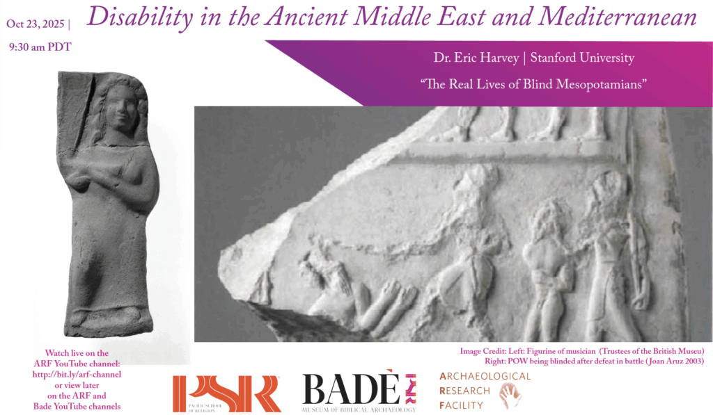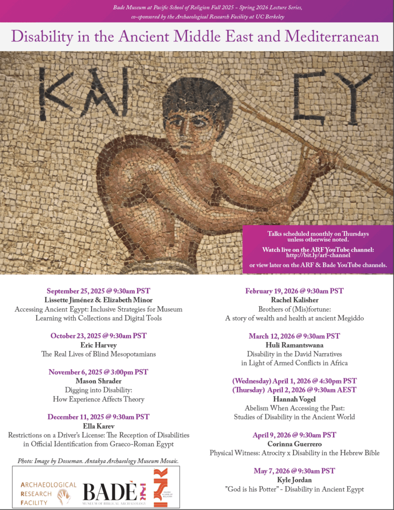 The Badè Museum is happy to announce our new 2025-2026 lecture series, “Disability in the Ancient Middle East and Mediterranean.” Lectures begin on September 25th. This lecture series is co-hosted by Pacific School of Religion and the Archaeological Research Facility – Berkeley. Watch live on the ARF YouTube channel here: http://bit.ly/arf-channel.