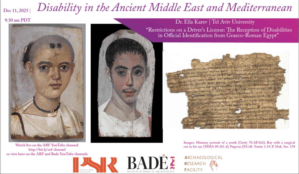 The Badè Museum is happy to announce our new 2025-2026 lecture series, “Disability in the Ancient Middle East and Mediterranean.” Lectures begin on September 25th. This lecture series is co-hosted by Pacific School of Religion and the Archaeological Research Facility – Berkeley. Watch live on the ARF YouTube channel here: http://bit.ly/arf-channel.